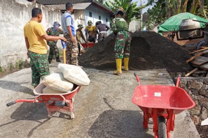 LCN – Blitar – Babinsa Desa Ploso Posramil Selopuro Koramil 0808/12 Wlingi Serda Eko Prayitno, bersama warga melaksanakan kegiatan gotong royong merabat (mengecor) jalan menuju pemakaman u...
