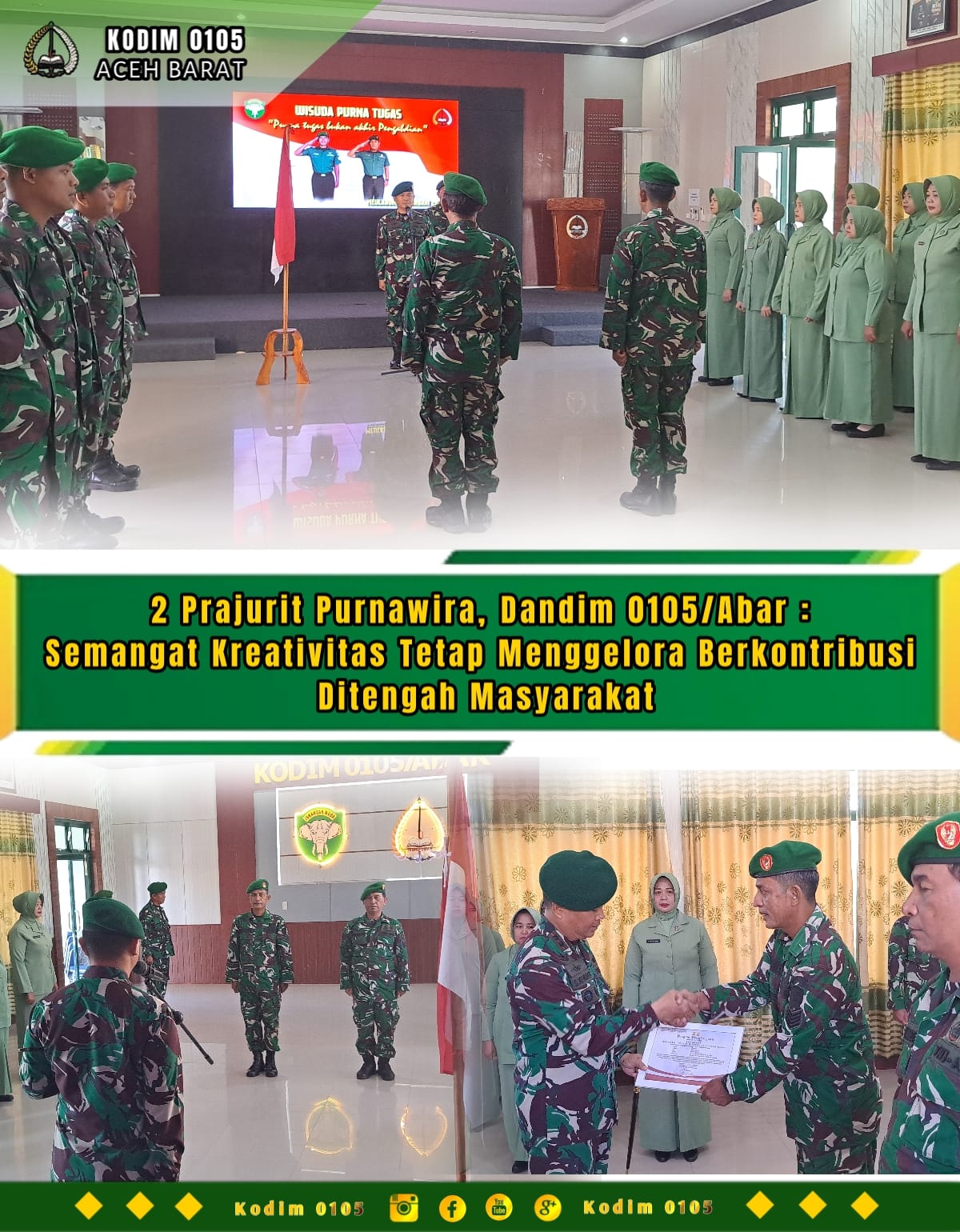 Adapun Prajurit yang memasuki masa purnatugas ialah Serma Mukhlasin dan Serka Rahman Rambe. Sedangkan untuk prosesi rangkaian Upacara diikuti oleh para Perwira Staf, Danramil – Danposramil, Bintara dan Tamtama hingga Ketua Persit KCK Cabang XXVIII Dim 0105/Abar Ny. Aurora S Kembaren beserta Ibu – Ibu Pengurus.