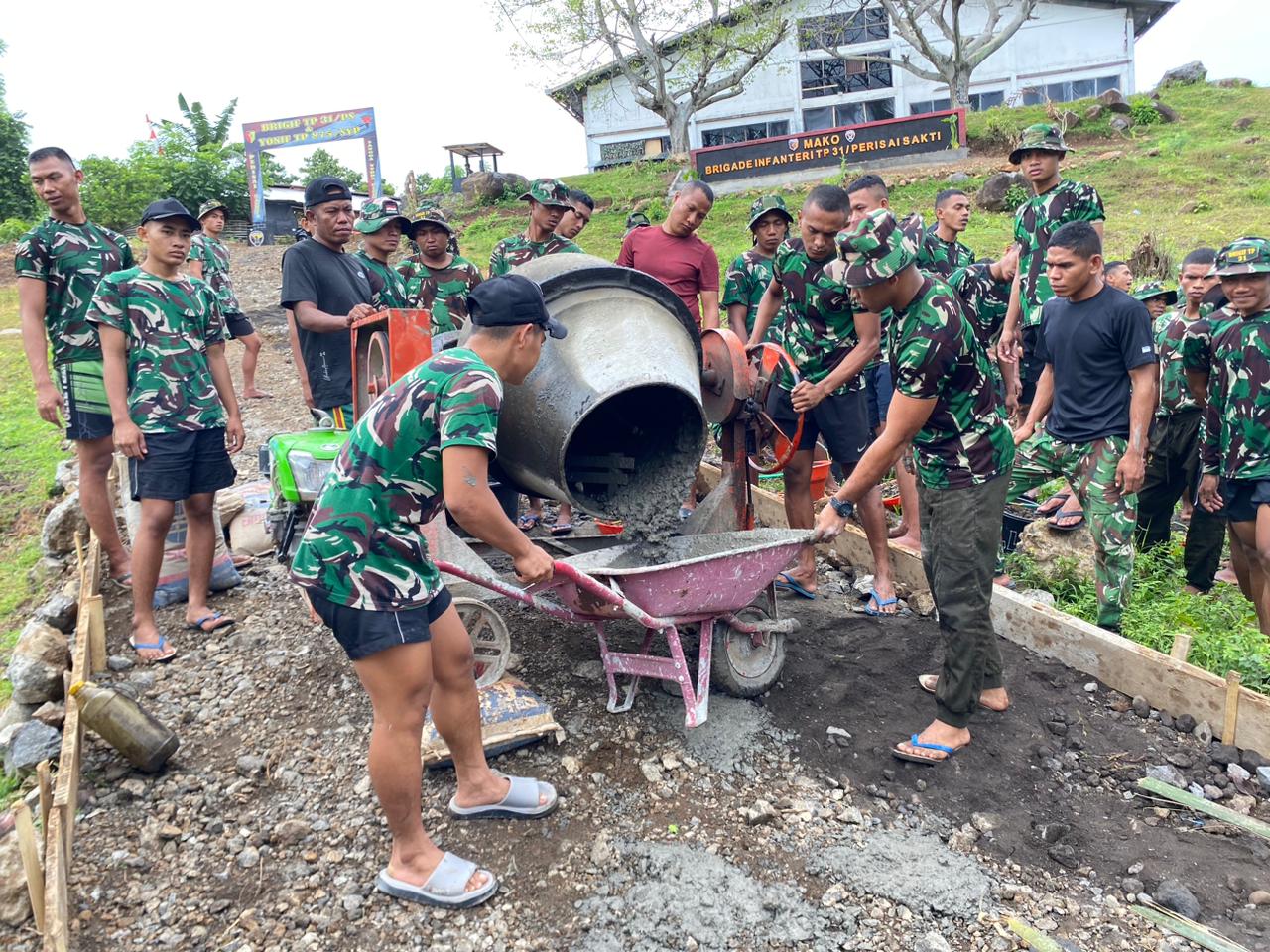 Para prajurit terlihat antusias, saling bekerja sama, serta menjaga ritme pekerjaan agar hasil pengecoran dapat selesai tepat waktu dan sesuai standar.