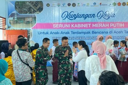 LCN – Aceh Tamiang – Komandan Batalyon Zeni Tempur (Yonzipur) 10/JP/2 Kostrad, Letkol Czi Amito Surya Mutiara, S.I.P., M.I.P., memaparkan progres pekerjaan rehabilitasi SDN 1 Sungai Liput ...