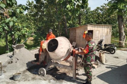 LCN – Boyolali. Babinsa Koramil 13/Nogosari Kodim 0724/Boyolali, Serka Wahyono, melakukan pemantauan langsung perkembangan pembangunan jembatan beton yang menghubungkan Kecamatan Nogosari dan Ke...