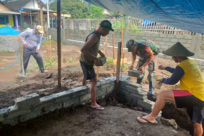 LCN – Blitar – Babinsa Kelurahan Ngadirejo Koramil 0808/01 Sukorejo Sertu Mohamad Nurhasan, melaksanakan kegiatan gotong royong membantu perehaban rumah dan fasilitas MCK milik warga berna...