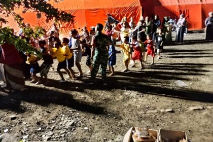 Babinsa dan Relawan Gelar Permainan Edukatif untuk Pulihkan Psikis Anak-Anak Pengungsi di Pronojiwo.