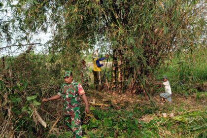 LCN – Blitar – Babinsa Kelurahan Bence Koramil 0808/02 Garum Serma Yuda Indra bersama kelompok Tani (Poktan) Margo Utomo melaksanakan kegiatan pembersihan dan pemotongan pohon bambu yang m...