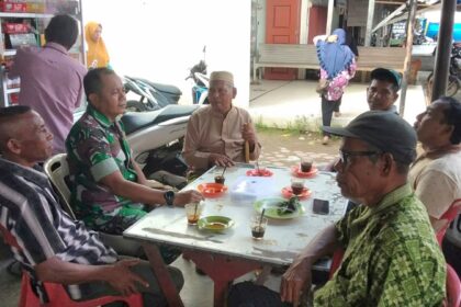 LCN – Aceh Utara – Babinsa Koramil 02/Kuta Makmur Sertu Marizal melaksanakan komunikasi sosial (Komsos) dengan tokoh masyarakat Bakhtiar di Desa Panton Rayeuk 2, Kecamatan Kuta Makmur, Kab...