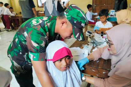 LCN – Boyolali – Babinsa Koramil 10/Sambi Kodim 0724/Boyolali, Serma Edi Mulyono bersama Serka Dwi Haryanto, mendampingi pelaksanaan program Bulan Imunisasi Anak Sekolah (BIAS) di SD/MI Desa Sam...