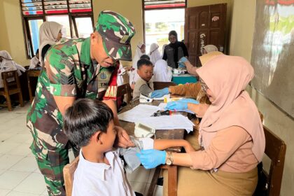 Timceyber—Boyolali – Babinsa Koramil 10/Sambi Kodim 0724/Boyolali, Serma Edi Mulyono bersama Serka Dwi Haryanto, mendampingi pelaksanaan program Bulan Imunisasi Anak Sekolah (BIAS) di SD/MI Desa...