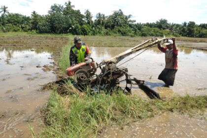 LCN – Samatiga – Komitmen TNI dalam mendukung ketahanan pangan nasional kembali terlihat nyata di lapangan. Kali ini, Babinsa Koramil 09/Samatiga, Kopda Hendrawan, turun langsung ke sawah memban...