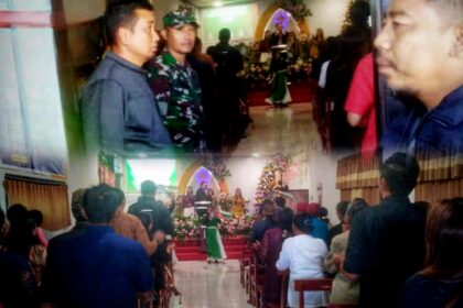 LCN – Dompu, – NTB, Sebanyak 150 prajurit Denma Brigif TP/31/Perisai Sakti turut serta dalam perayaan Natal bersama umat Kristiani di Gereja (GPDI) Dusun Latonda, Kecamatan Pekat, Kabupate...