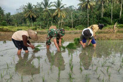 LCN – Blitar – Babinsa Desa Panggungrejo Koramil 0808/18 Panggungrejo sertu Sudarto melaksanakan pendampingan kepada Kelompok Tani (Poktan) Tunas Jaya dalam kegiatan tanam padi dilahan mil...