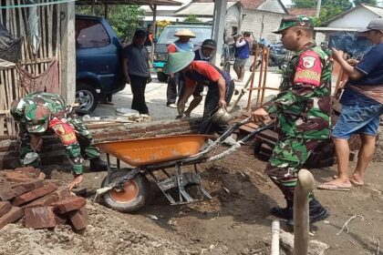 LCN – Blitar – Peran aktif Babinsa Desa Wonodadi Koramil 0808/22 Wonodadi Kopka Ihwanudin gotong royong bersama warga dalam kegiatan kerja bakti pembangunan pondasi rumah sederhana milik Bapak R...