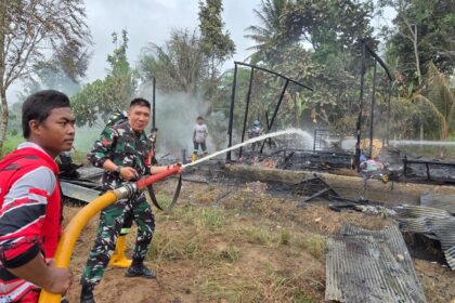 Timcyber—BARABAI – Personel Koramil 1002-01/Batang Alai Selatan bersama relawan Barisan Pemadam Kebakaran (BPK) 654 dan Damkar Kabupaten Hulu Sungai Tengah (HST) sigap melakukan pemadaman kebaka...