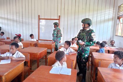 LCN – Serambakon – Pegunungan Bintang. Personel Pos Serambakon Satgas Pamtas RI–PNG Yonif 751/Vira Jaya Sakti (VJS) melaksanakan anjangsana ke SD Inpres Dimbalip, Distrik Serambakon, guna ...