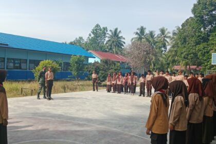 LCN – HULU SUNGAI TENGAH – Babinsa Koramil 1002-04/Labuan Amas Selatan, Sertu Slamet Hariyadi, melaksanakan kegiatan pembinaan Pramuka kepada para siswa SMP Negeri 9 Hulu Sungai Tengah, Sabtu (2...