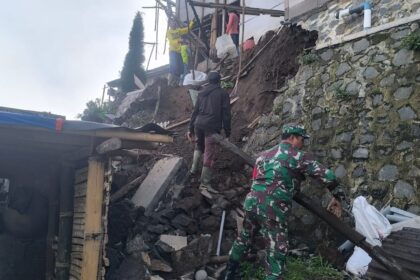 LCN – Pasuruan, – Serma Hardika dan Kopka Adi Riyanto anggota Koramil 0819/26 Tosari bersama warga masyarakat membantu proses evakuasi korban tanah longsor dan membersihkan puing puing ban...