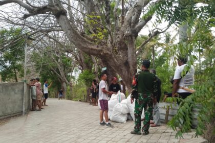 LCN – Lombok Utara – NTB, Bintara Pembina Desa (Babinsa) Gili Indah, Komando Rayon Militer (Koramil) 1606-02/Tanjung, bersama warga dan pemuda setempat bahu-membahu membersihkan lingkungan...