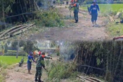 LCN – Pasuruan, – Babinsa Sukorame, Serda Heru, anggota Koramil 0819/23 Sukorejo bersama warga Dusun Suco, Kecamatan Sukorejo, Kabupaten Pasuruan, melaksanakan kegiatan kerja bakti pada Se...
