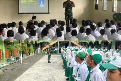 LCN – Pasuruan, – Anggota Koramil 0819/19 Prigen, Sertu Eko Prasetyo Babinsa Kelurahan Pecalukan, Kecamatan Prigen, memberikan pembekalan wawasan kebangsaan dan bela negara kepada siswa-si...