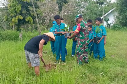 LCN – Blitar – Babinsa Desa Ngeni Subramil Wonotirto Koramil 0808/09 Sutojayan Serda Aga Panoto bersama para siswa SMPN 2 Wonotirto Desa Ngeni melaksanakan kegiatan penanaman pohon trembes...