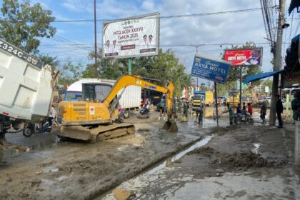 LCN – Satuan Tugas Prajurit Batalyon 10 Kostrad bergerak cepat membantu proses pembersihan sisa material pasca-bencana banjir bandang diruas jalan utama dan area Desa Kota Lintang, Kabupaten Ace...