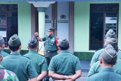 LCN – Blitar – Usai pelaksanaan tradisi korps penerimaan pejabat baru, Komandan Kodim 0808/Blitar Letkol Inf. Virlani Arudyawan memberikan Jam Komandan kepada seluruh prajurit dan PNS Kodi...