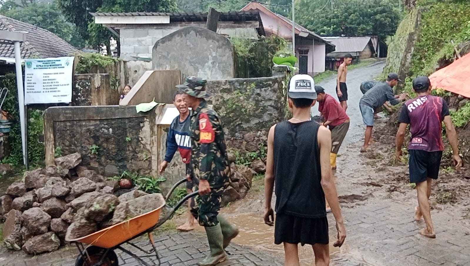 Babinsa Bantu Pembersihan Tanah Longsor Akibat Hujan deras