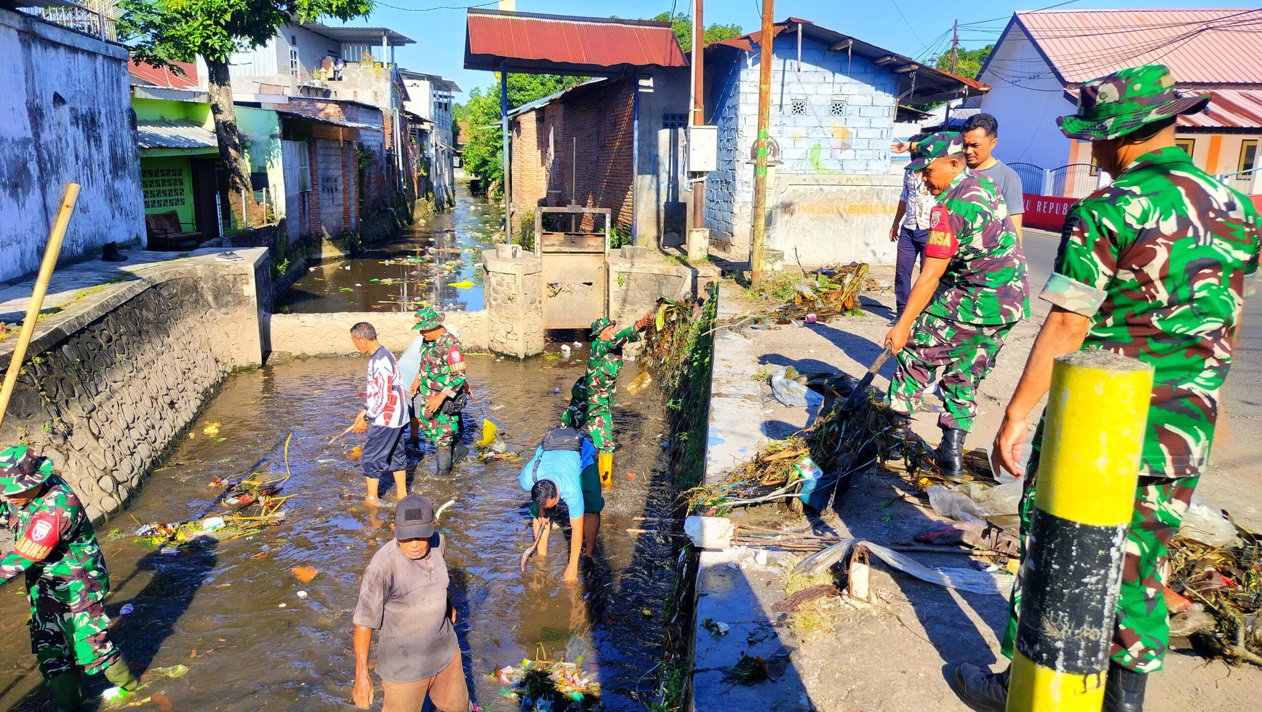 LCN – Mataram, – NTB, Suasana berbeda tampak di Lingkungan Karang Kelok Baru, Kelurahan Monjok Barat, Kota Mataram. Sejak pagi hari, sejumlah anggota Bintara Pembina Desa (Babinsa) Komando Rayon Militer (Koramil) 1606-05/Mataram bersama warga dan staf kelurahan turun langsung ke bantaran kali, membawa cangkul, sekop, dan karung, memulai aksi nyata membersihkan aliran sungai dari tumpukan sampah dan endapan lumpur, Kamis (02/04/2026).