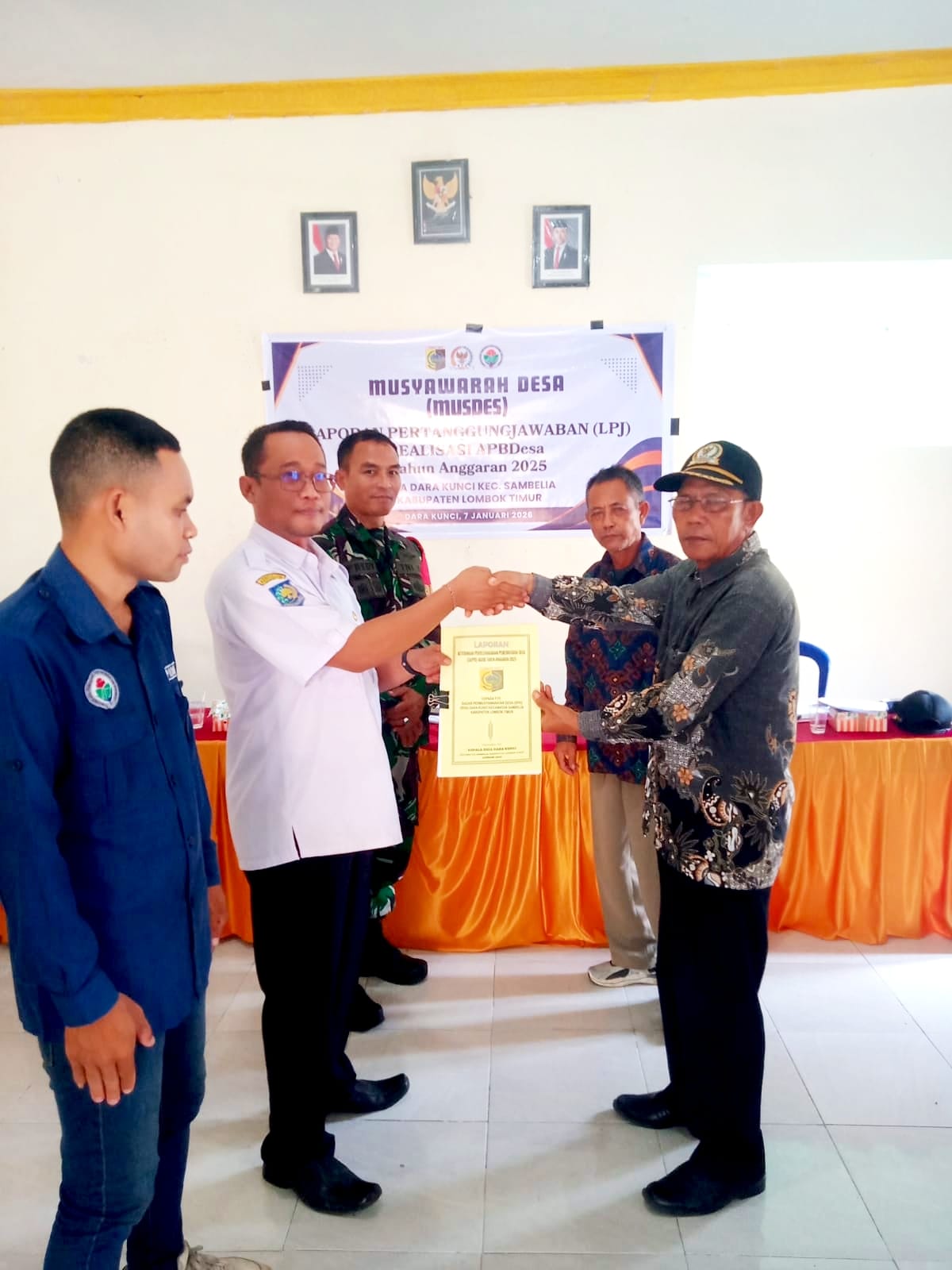 LCN – Lombok Timur – NTB, Babinsa Desa Darakunci Koramil Sambelia, Pelda Fredy William, L., menghadiri undangan Musyawarah Desa (Musdes) Laporan Pertanggungjawaban Realisasi Pelaksanaan Anggaran Pendapatan dan Belanja Desa (APBDes) Tahun Anggaran 2025 yang dilaksanakan di Aula Kantor Desa Darakunci, Kecamatan Sambelia, Kabupaten Lombok Timur. Rabu (28/01/2026).