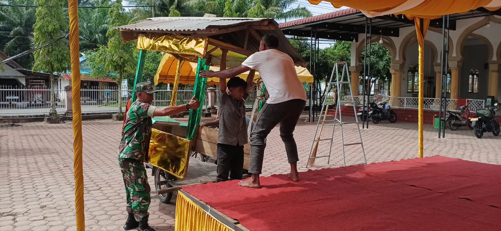 Serda Sofyan tampak membantu berbagai aspek persiapan teknis , mulai dari pemasangan tenda, pengaturan kursi, pengaturan panggung, hingga memastikan kelancaran logistik acara. “MTQ bukan sekedar lomba membaca Al-Qur’an, tapi juga momentum untuk memperkuat ukhuwah Islamiyah dan membangun karakter generasi muda yang cinta Al-Qur’an,”ujar Serda Sofyan dengan penuh semangat.