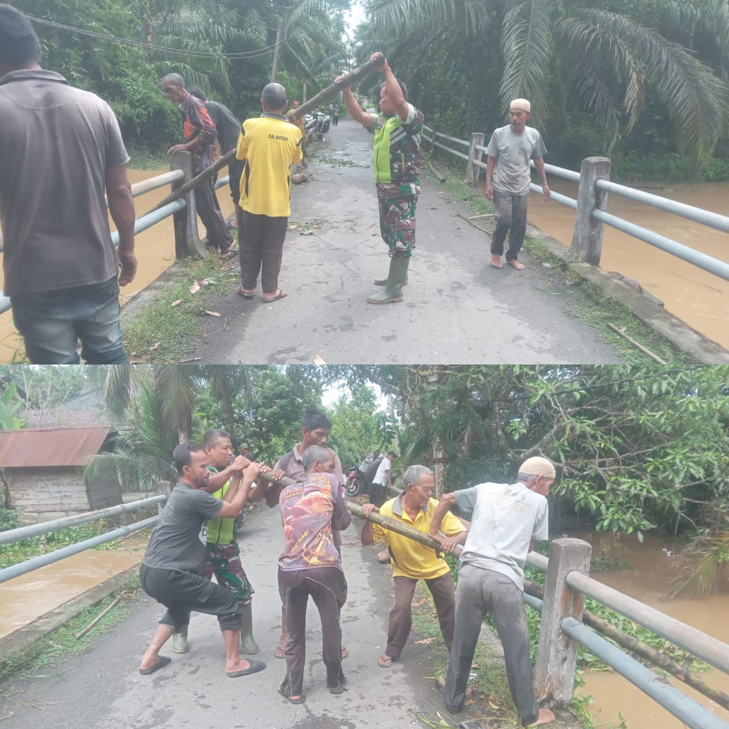 Material kayu dan sampah yang terbawa arus deras berpotensi menimbulkan banjir serta merusak infrastruktur jembatan. Menyadari ancaman tersebut, Sertu Heru Santoso segera berkoordinasi dengan perangkat Desa dan mengajak warga untuk turun langsung ke lokasi. Dengan alat seadanya, warga bersama Babinsa bahu-membahu mengangkat kayu besar, membersihkan sampah dan memastikan aliran sungai kembali lancar.