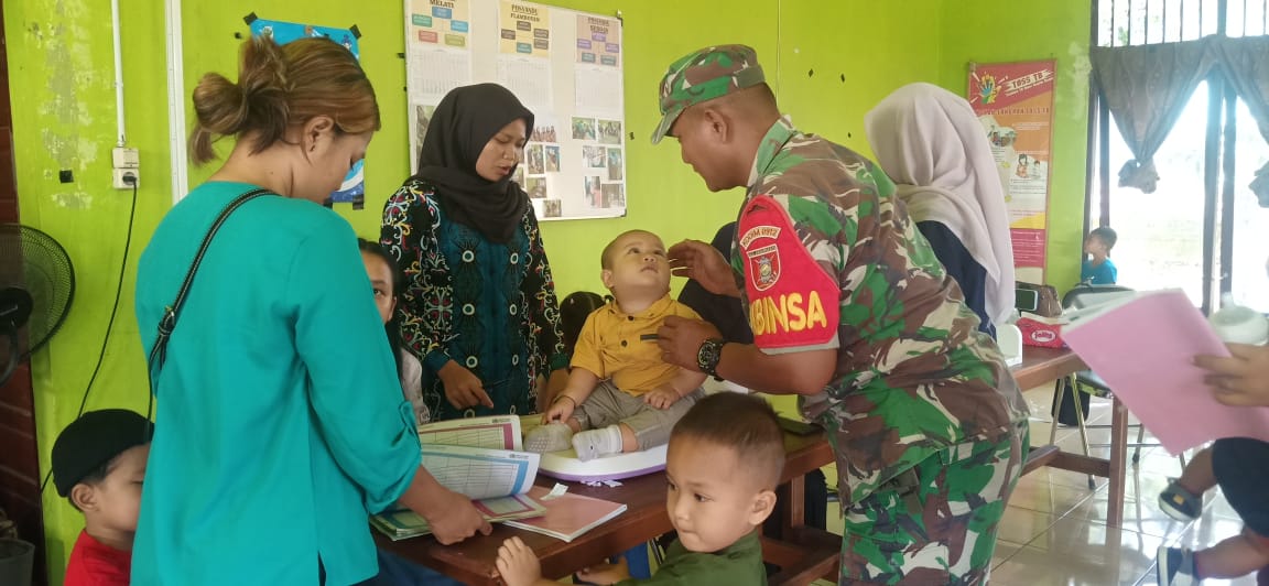 LCN – Kutai Barat – Dalam rangka mendukung program pemerintah dibidang kesehatan masyarakat, Babinsa Koramil 0912-10/Bongan Sertu Marjuki melaksanakan pendampingan kegiatan Posyandu Flamboyan yang berlangsung di Kampung Jambuk Makmur, Kecamatan Bongan, Kabupaten Kutai Barat, Senin (13/10/2025).