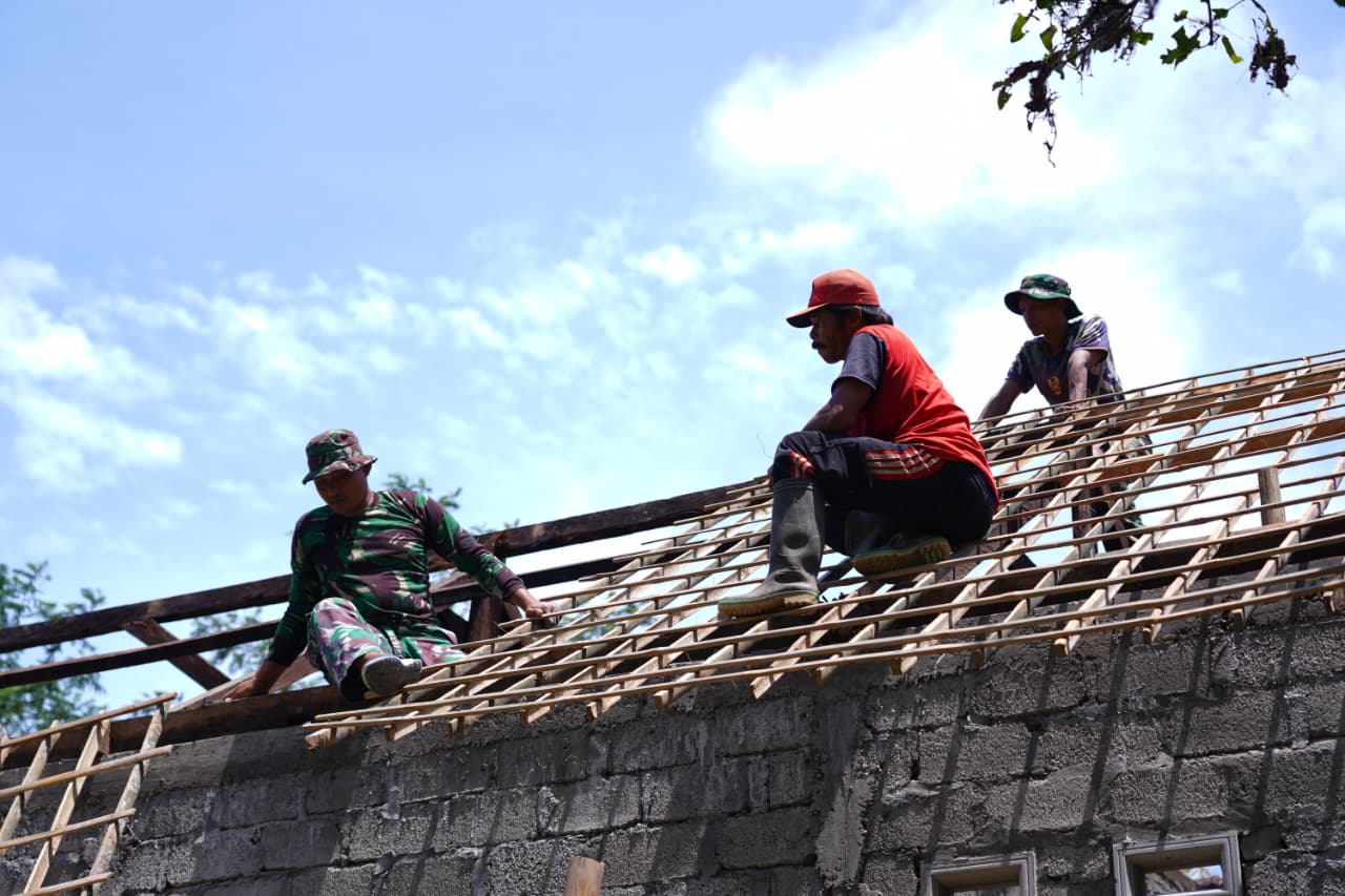 LCN – Blitar – Anggota Satgas TMMD Ke-127 Kodim 0808/Blitar bersama warga bahu-membahu memasang genteng/atap dalam program renovasi Rumah Tidak Layak Huni (RTLH) milik Mbah Ayem di Dusun Krisik, Desa Krisik, Kecamatan Gandusari, Kabupaten Blitar, Selasa (24/02/2026). Kegiatan ini dilaksanakan dengan semangat gotong royong demi memastikan rumah yang direnovasi menjadi layak, aman, dan nyaman dihuni.