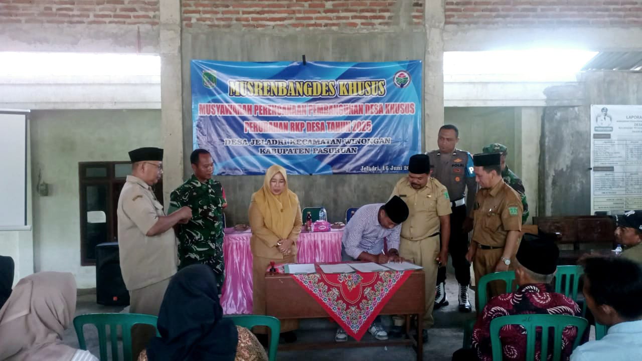 LCN – Pasuruan, Dalam rangka menyusun dan menetapkan Perubahan Rencana Kerja Pemerintah Desa (RKPDes) Tahun Anggaran 2025, Pemerintah Desa Sumberrejo, Kecamatan Winongan, Kabupaten Pasuruan menggelar kegiatan Musyawarah Perencanaan Pembangunan Desa Khusus (Musrenbangdes), Senin (16/06/2025). Acara ini turut dihadiri oleh berbagai unsur pemerintahan dan lembaga desa, termasuk Peltu Winarto selaku Batuud Koramil 0819/15 Winongan.