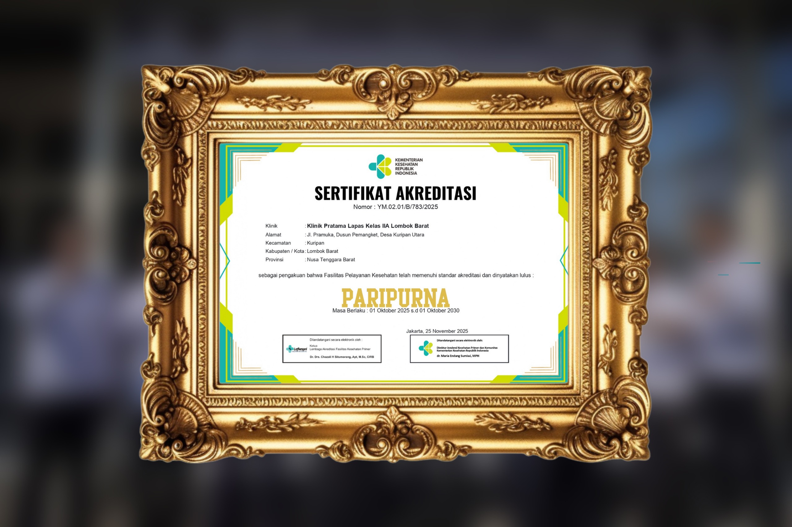 LCN – Lombok Barat – NTB, Klinik Pratama Lapas Kelas IIA Lombok Barat akhirnya mengantongi Akreditasi Paripurna, predikat tertinggi yang diberikan oleh Kementerian Kesehatan RI dan Lembaga Fasilitas Kesehatan Primer (Lafkespri). Capaian ini diraih setelah serangkaian evaluasi yang menilai standar mutu layanan, sistem manajemen, serta kelayakan fasilitas kesehatan dilingkungan pemasyarakatan.