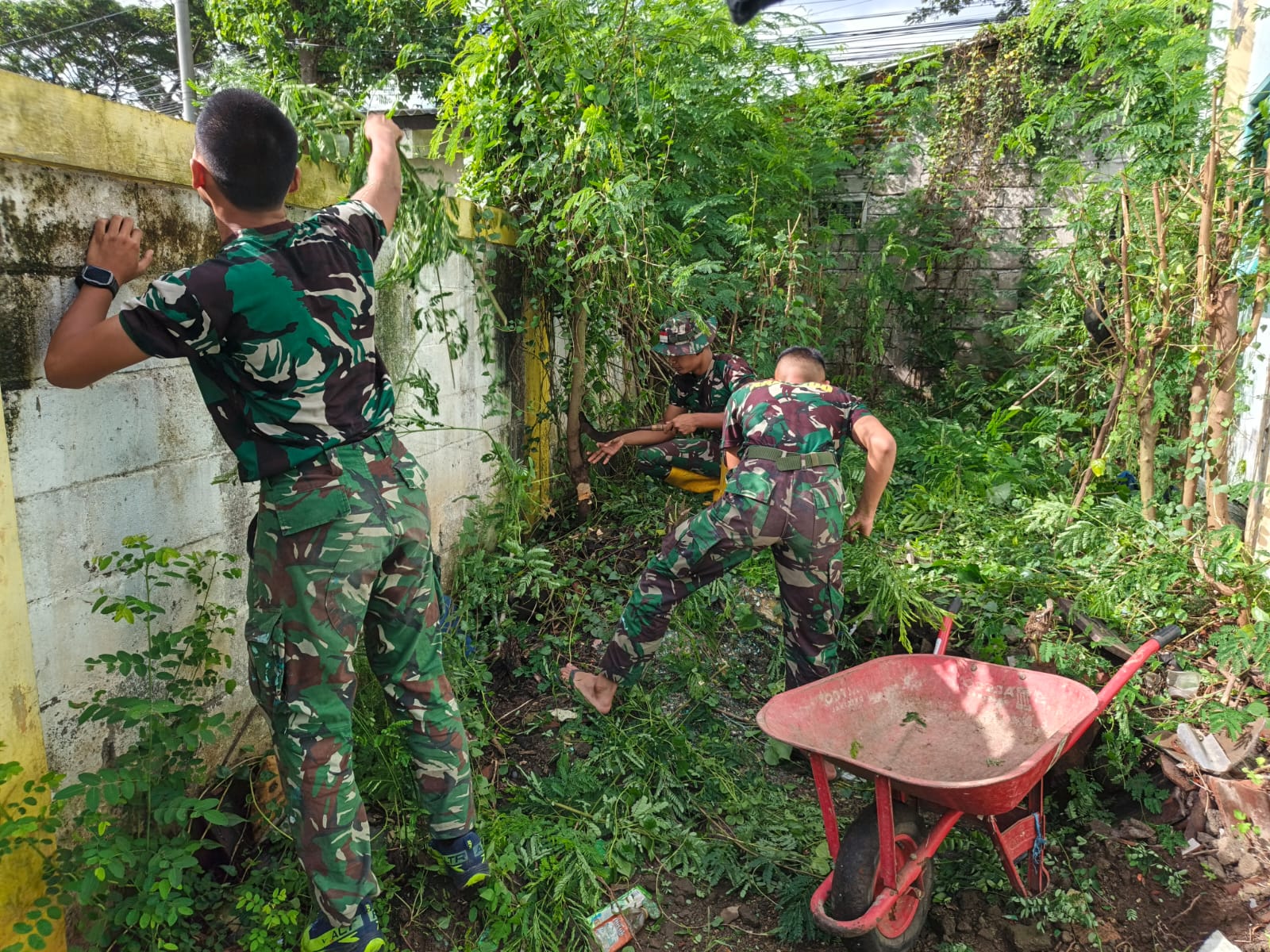 Dengan penuh semangat kebersamaan, personel satgas bahu-membahu membersihkan sampah, memangkas rumput liar, serta merapikan lingkungan sekolah agar tampak lebih bersih, rapi dan sehat.
