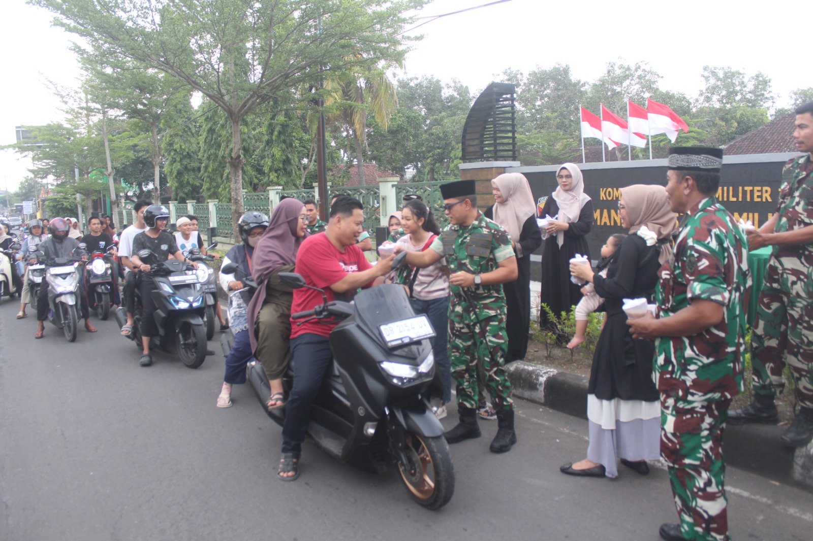 Senyum ramah terpancar dari para prajurit dan anggota Persit saat menyapa warga sembari menyerahkan paket makanan dan minuman ringan berupa kolak sebagai pelengkap menu berbuka puasa.
