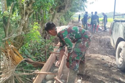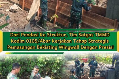 LCN – Aceh Barat – Solid dan terukur, Tim Satgas TMMD Reguler ke-127 Kodim 0105/Abar bersama masyarakat terus memantapkan tahapan pemasangan papan mall wingwall di Desa Pasi Aceh, Kecamatan Woyl...