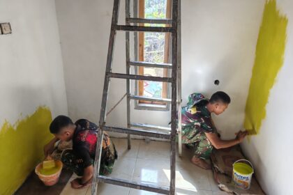 LCN – Pasuruan, – Disebuah rumah sederhana di Dusun Ngepreng, prajurit Satgas TMMD Ke-127 Kodim 0819/Pasuruan tampak mengecat dinding rumah. Satu prajurit berdiri diatas tangga menjangkau ...