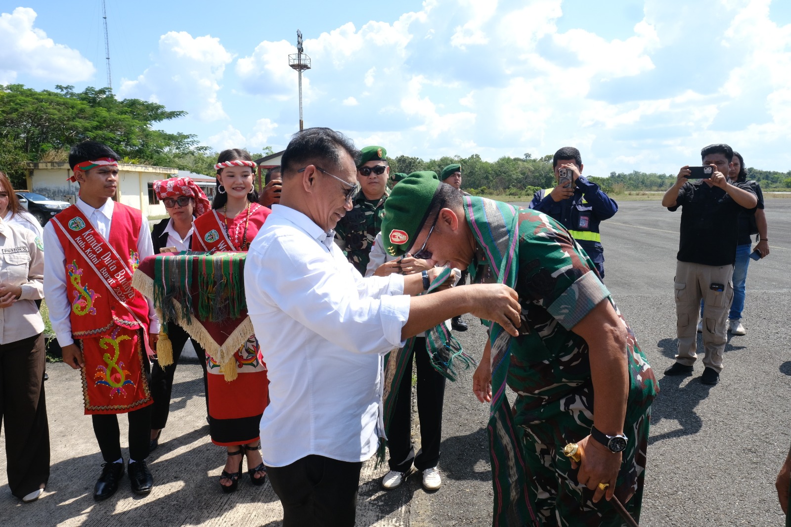 LCN – Kutai Barat – Komandan Kodim 0912/Kutai Barat Letkol Inf Doni Fransisco, S.Sos., M.Han., bersama Wakil Bupati Kutai Barat H. Nanang Adriani, S.PKP., M.Si., menyambut kedatangan Komandan Pusat Teritorial Angkatan Darat (Danpusterad) Letnan Jenderal TNI Mochamad Syafei Kasno beserta Danrem 091/Asn Brigjen TNI Anggara Sitompul, S.I.P., M.Si. dan rombongan di Bandara Melalan, Melak, Kampung Bohoq, Kecamatan Barong Tongkok, Rabu (15/10/2025) pukul 14.00 WITA.