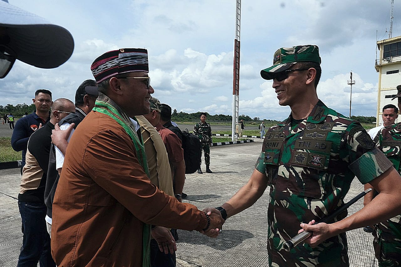 LCN – Kutai Barat – Komandan Kodim 0912/Kutai Barat Letkol Inf Doni Fransisco, S.Sos., M.Han. bersama Wakil Bupati Kutai Barat Nanang Andriani, S.PKP., M.Si. menyambut kedatangan Wakil Gubernur Kalimantan Timur Ir. H. Seno Aji, M.Si. dan rombongan di Bandara Melalan, Kecamatan Barong Tongkok, Minggu, 19 Oktober 2025.
