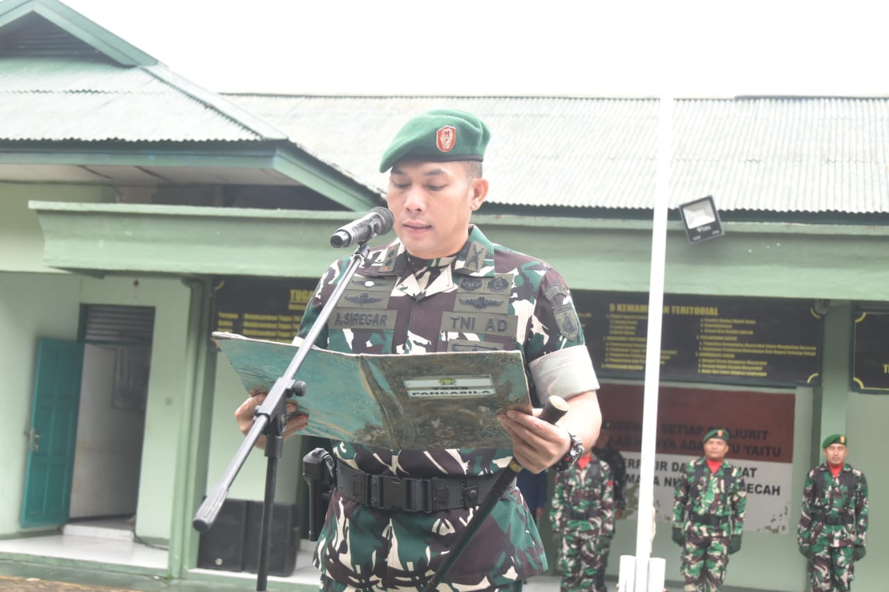 Pengucapan Sapta Marga oleh Serda Ridwan, Pengucapan Sumpah Prajurit oleh Serda M. Iqbal, serta Pengucapan Delapan Wajib TNI oleh Kopda Mar’i.