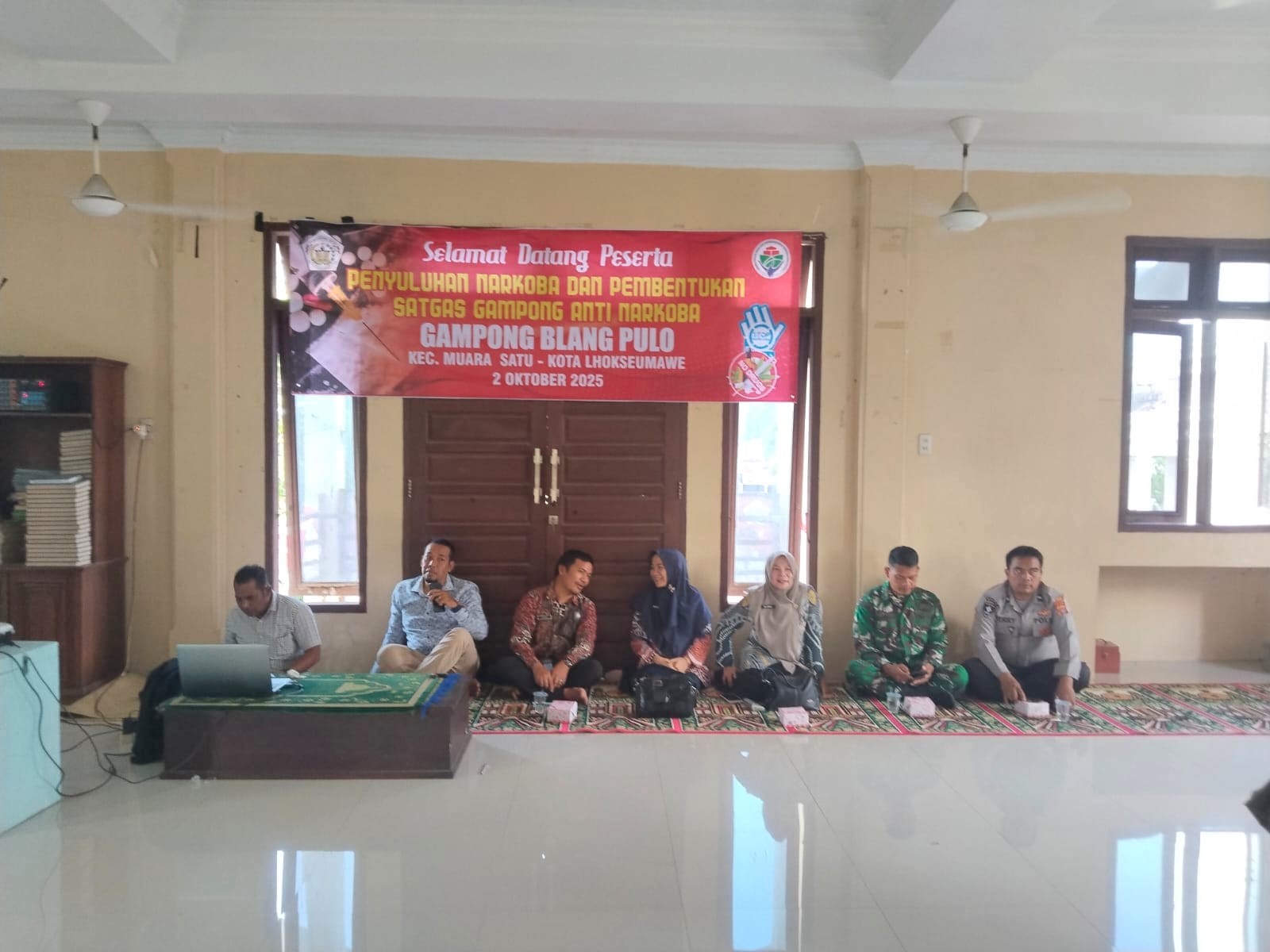 LCN – Aceh Utara – Danramil 01/Mrs yang diwakili Pelda Firmansyah menghadiri kegiatan sosialisasi bahaya narkoba sekaligus pembentukan Satgas Anti Narkoba di Desa Blang Pulo, Kecamatan Muara Satu, Kota Lhokseumawe. Jumat (03/10/2025). Kegiatan tersebut mendapat dukungan penuh dari unsur pemerintah, TNI, Polri, BNN serta perangkat Desa.