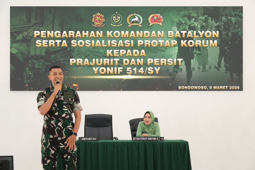 LCN – Bondowoso – Dalam rangka memperkuat kedisiplinan serta mempersiapkan pelaksanaan tugas operasi luar negeri, prajurit dan Persit Yonif 514/Sabaddha Yudha (SY) menerima pengarahan serta sosialisasi Protap Korum dari Komandan Batalyon Infanteri 514/SY, Letkol Inf Ugroseno. Kegiatan tersebut berlangsung di Aula Widjojo Soejono, Mayonif 514/SY, Curahdami, Bondowoso. Kamis (12/03/2026).