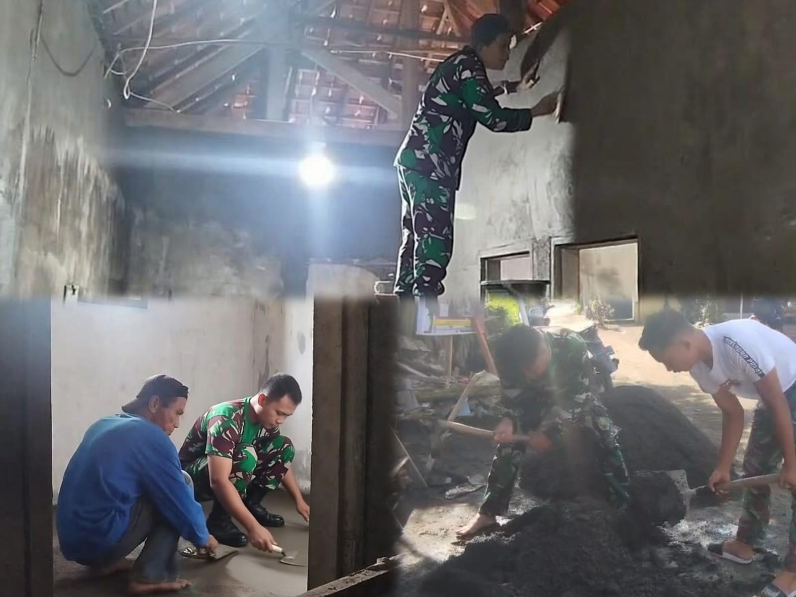 Pekerjaan plester dilakukan secara gotong royong oleh personel Satgas TMMD bersama warga setempat. Tahap ini menjadi bagian penting dalam proses pembangunan rumah agar bangunan semakin kokoh, rapi dan nyaman untuk ditempati.