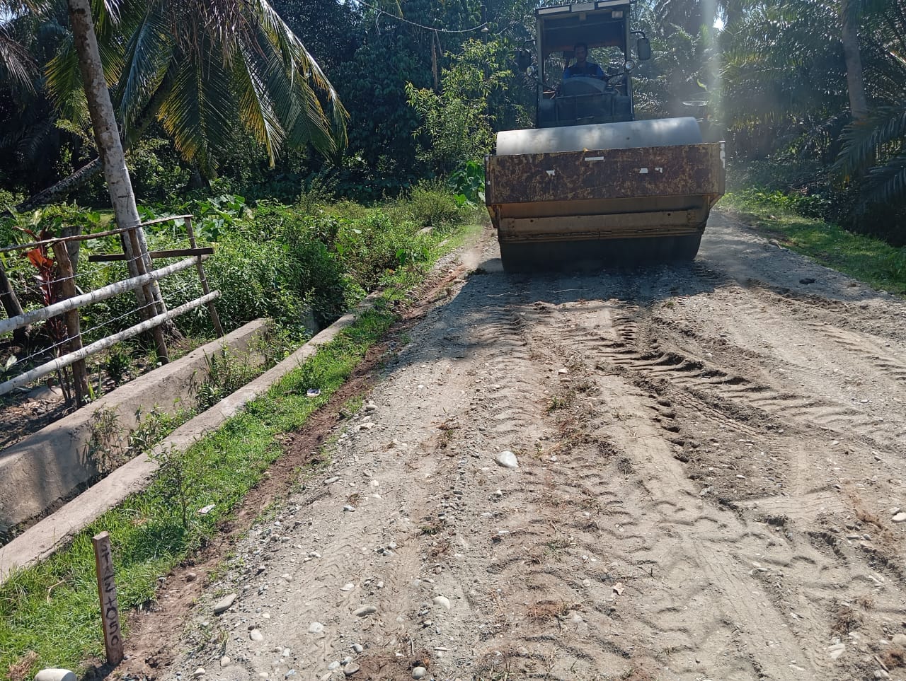 LCN – Aceh Barat – Dentuman alat berat compactor Satgas TMMD Reguler ke-127 Kodim 0105/Abar menggetarkan dan memadatkan timbunan sirtu disepanjang badan jalan penghubung Desa Pasi Aceh menuju Desa Lueng Jawa, Kecamatan Woyla, Senin (09/03/2026)