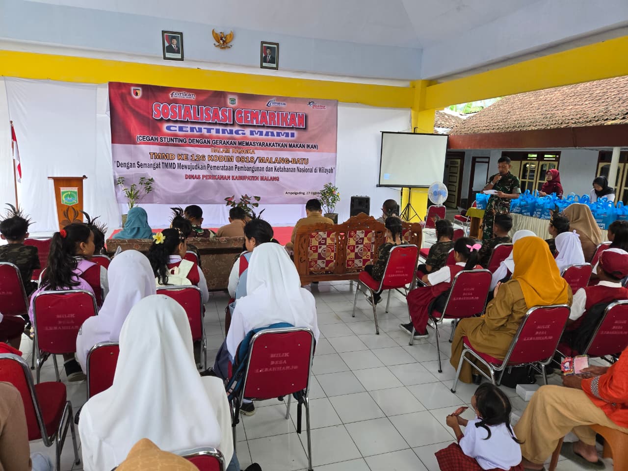 LCN – Dalam rangkaian kegiatan TNI Manunggal Membangun Desa (TMMD) ke-126, Dinas Perikanan Kabupaten Malang menggelar Sosialisasi Gerakan Memasyarakatkan Makan Ikan (Gemarikan) yang bertempat di Balai Desa Lebakharjo, Kecamatan Ampelgading,kabupaten malang, Selasa (28/10/2025).