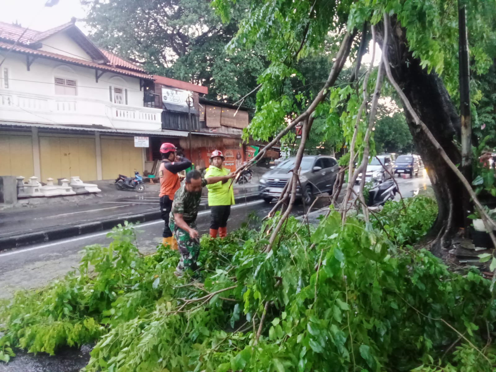 LCN – Surakarta – Babinsa Kelurahan Manahan Koramil 02/Banjarsari Kodim 0735/Surakarta Serma Saring bersama dengan petugas DLH Kota Surakarta dan Anggota Linmas Kelurahan Manahan serta Warga Masyarakat mengevakuasi pohon tumbang yang diakibatkan hujan deras disertai angin kencang di Jalan, A. Yani, Kelurahan Manahan Kecamatan Banjarsari, Jum’at (10/10/2025)