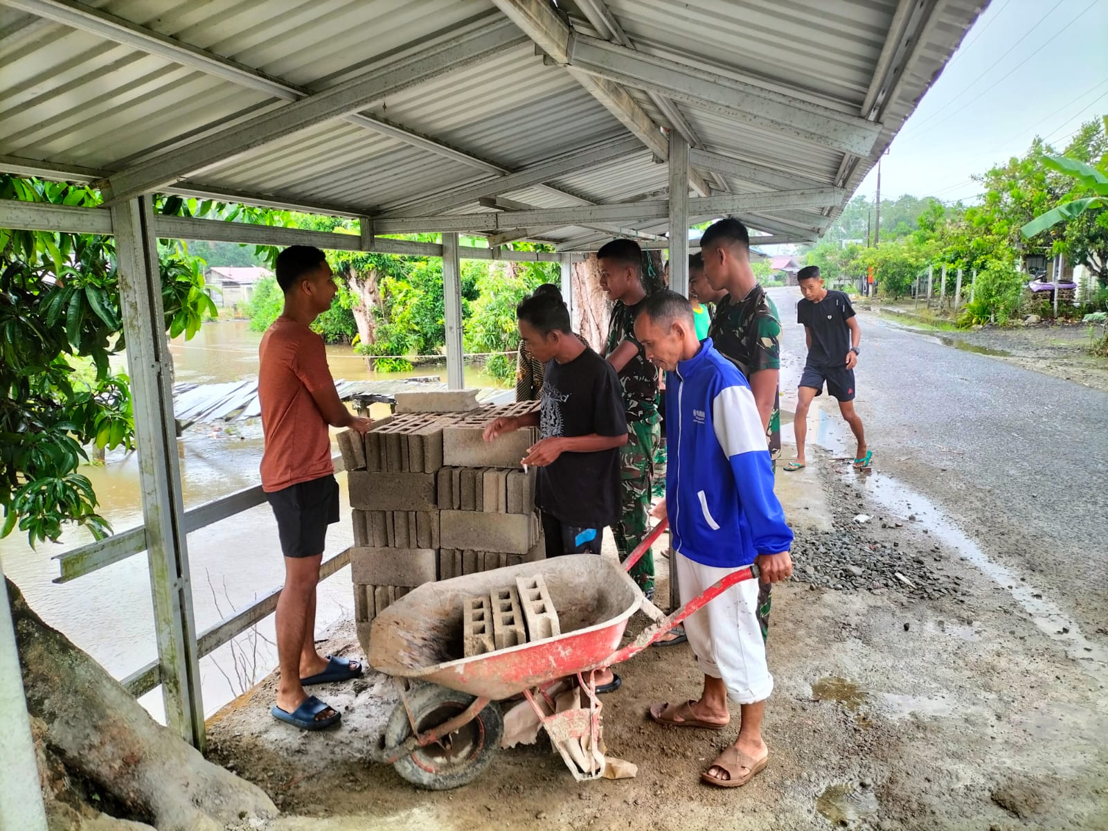 Dilapangan, terlihat anggota TNI bersama masyarakat bahu-membahu melakukan berbagai pekerjaan, mulai dari penataan material hingga persiapan konstruksi lanjutan.
