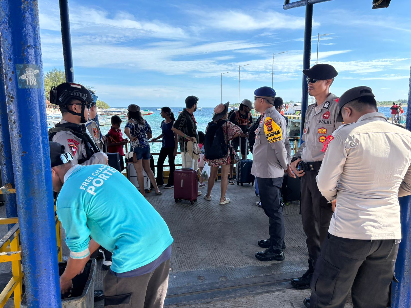 Bertempat di Pos Pengamanan Gili Trawangan, petugas melaksanakan monitoring intensif terhadap aktivitas bongkar muat kapal fast boat rute Lombok – Bali, Minggu (28/12/2025).