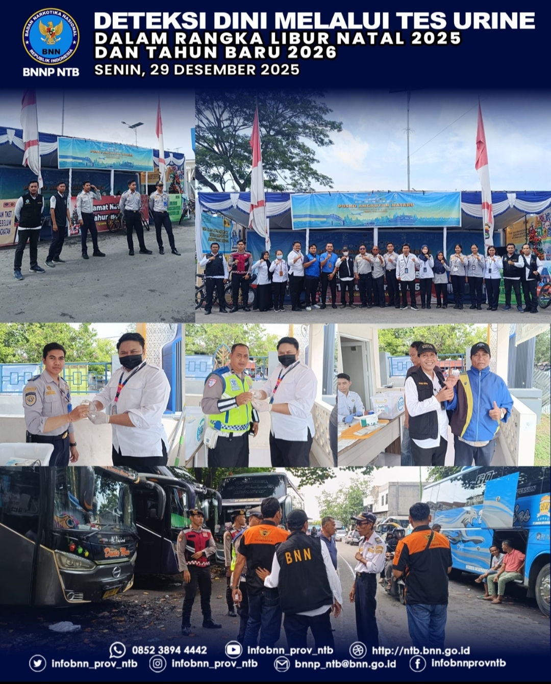 LCN – Mataram, — Badan Narkotika Nasional Provinsi Nusa Tenggara Barat (BNNP NTB), melaksanakan kegiatan Deteksi Dini melalui Tes Urine dalam rangka pengamanan Libur Natal 2025 dan Tahun Baru 2026. Kegiatan ini berlangsung, Senin, 29 Desember 2025, bertempat di Terminal Kelas I Mandalika, Kota Mataram.